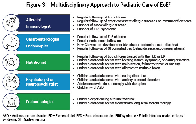 There is no single preferred therapy for EoE, and treatment decisions should be individualized based on age, disease severity, lifestyle, comorbidities, and family preferences, using shared decision-making.3,4 Optimal pediatric care is multidisciplinary, involving pediatric gastroenterologists, allergists/immunologists, registered dietitians or nutritionists, speech/feeding therapists when indicated, and primary care providers to address growth, feeding behaviors, and allergic comorbidities.16-19 This approach supports nutritional adequacy, growth, psychosocial well-being, and long-term disease control. (Figure 3)
